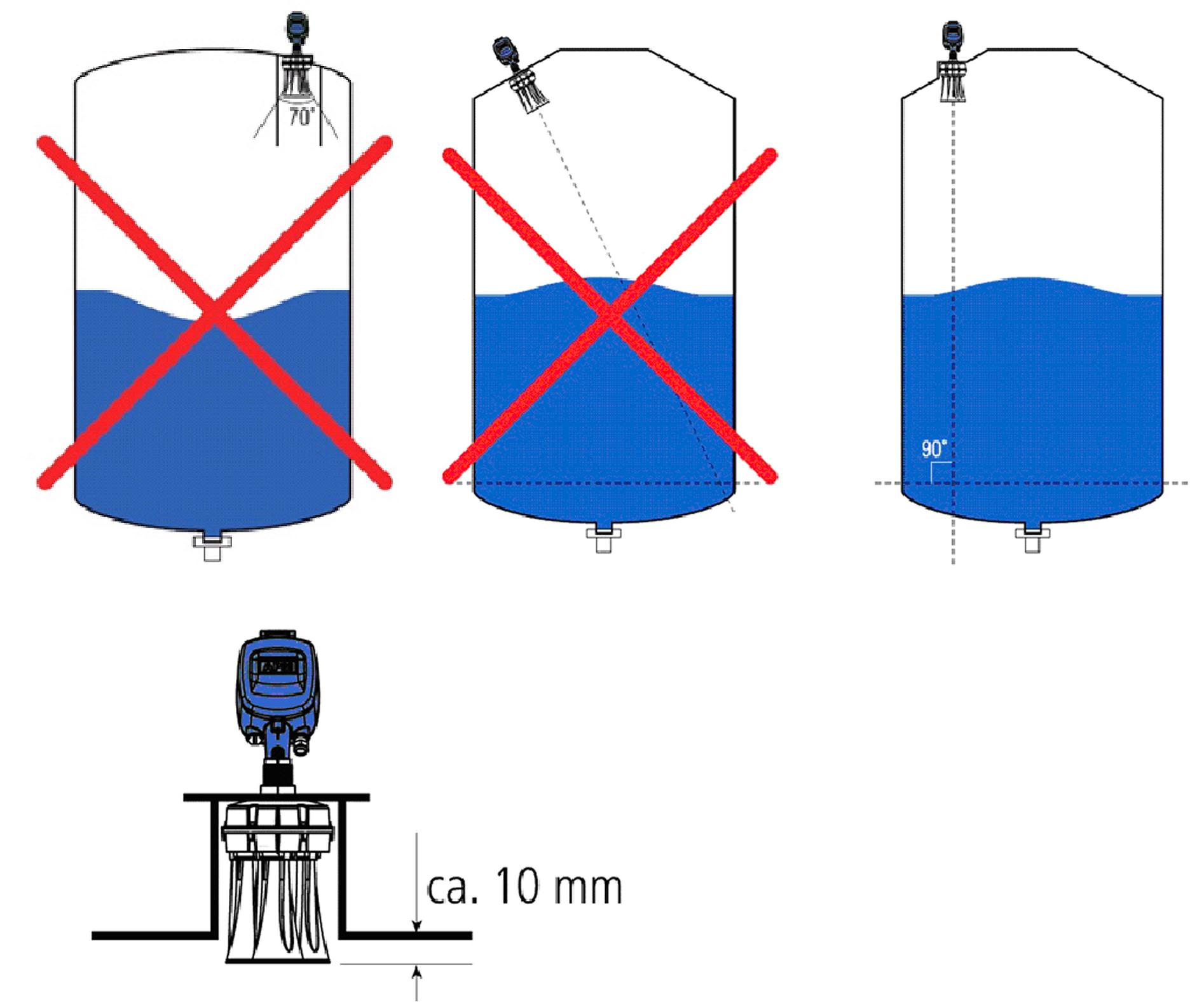 正確的安裝位置為:離罐壁距離為罐直徑1/6處,最小距離為500mm。 不可安裝在入料口上方。 盡可能避免罐內(nèi)障礙物,如開關(guān),儀表,加熱線圈,真空環(huán)和擋板等等 喇叭口進(jìn)入料倉不小于10mm 必須垂直安裝于料倉 |